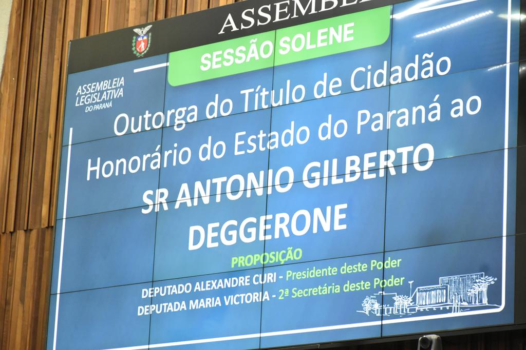 Antonio Gilberto Deggerone agradeceu a homenagem recebida na Assembleia Legislativa do Paraná após ser agraciado com o título de cidadão honorário do Estado. Em discurso emocionado, ele destacou que o reconhecimento reforça sua ligação com o Paraná. “Receber esse título é algo de grande peso, especialmente depois de uma noite memorável em minha vida, quando também recebi o Título de Cidadão Honorário de Curitiba”, afirmou.