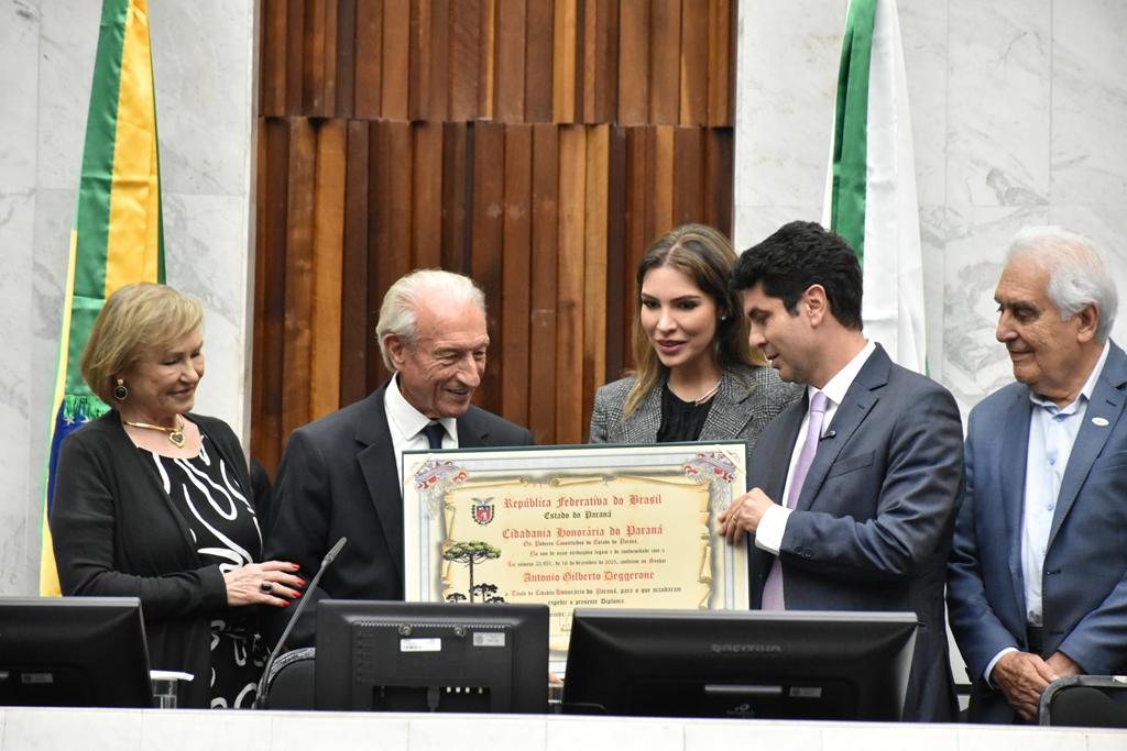 O presidente da Alep destacou a trajetória de Antonio Gilberto Deggerone como parte da própria história de desenvolvimento do Estado. Em seu discurso, lembrou que o Paraná foi construído por gerações de imigrantes e migrantes que chegaram em busca de oportunidades. “Esse Paraná é a soma das ideias que cada um trouxe na bagagem e da vontade de vencer na vida. Um desses vencedores é o nosso homenageado desta noite”, afirmou.