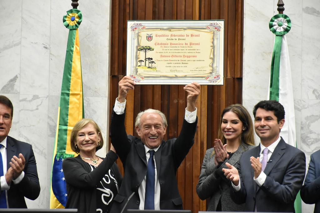 Curi ressaltou que Deggerone, nascido no Rio Grande do Sul e criado em Santa Catarina, construiu no Estado uma trajetória marcada pelo empreendedorismo e pela liderança no setor de comércio e serviços. Segundo ele, o empresário iniciou sua caminhada na Associação Comercial do Paraná como associado e, anos depois, chegou à presidência da entidade por mérito próprio. “Antonio Gilberto Deggerone sempre foi paranaense de fato, e agora também é de direito”, disse.