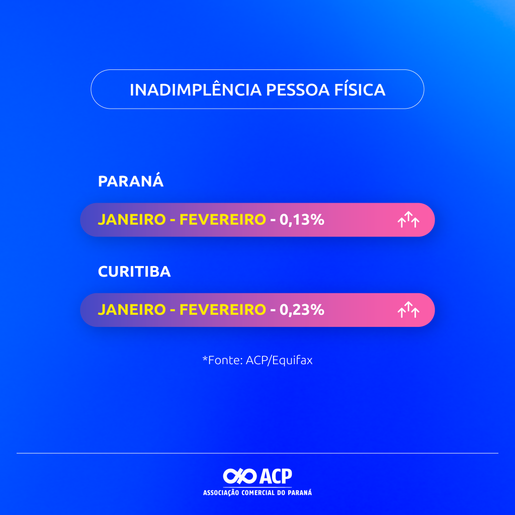 O Departamento de Inteligência de Dados da Associação Comercial do Paraná (ACP) divulgou os números atualizados de inadimplência de pessoa física no Estado e na capital paranaense. Os dados apontam leve alta no volume de consumidores com registro restritivo no mês de fevereiro, na comparação com janeiro.