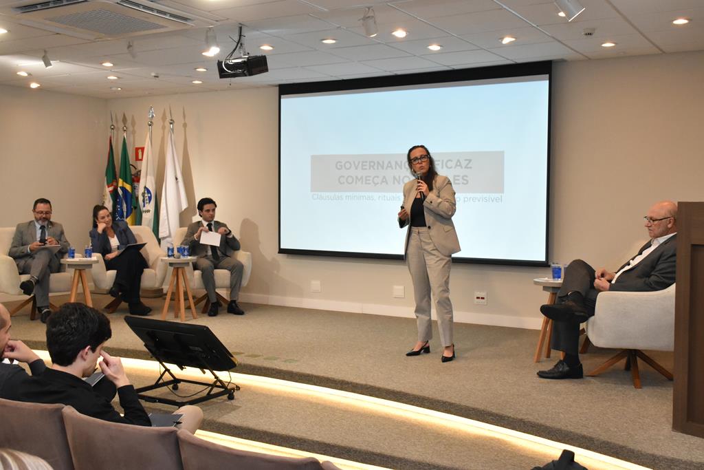 Em seguida, Natália Brotto defendeu que a governança, apesar de frequentemente vista como complexa, “pode e deve começar de forma simples, especialmente para pequenas e médias empresas”. Ela argumentou que a governança eficaz pode se iniciar com elementos básicos como um contrato social bem elaborado e um acordo de sócios, documentos muitas vezes negligenciados.